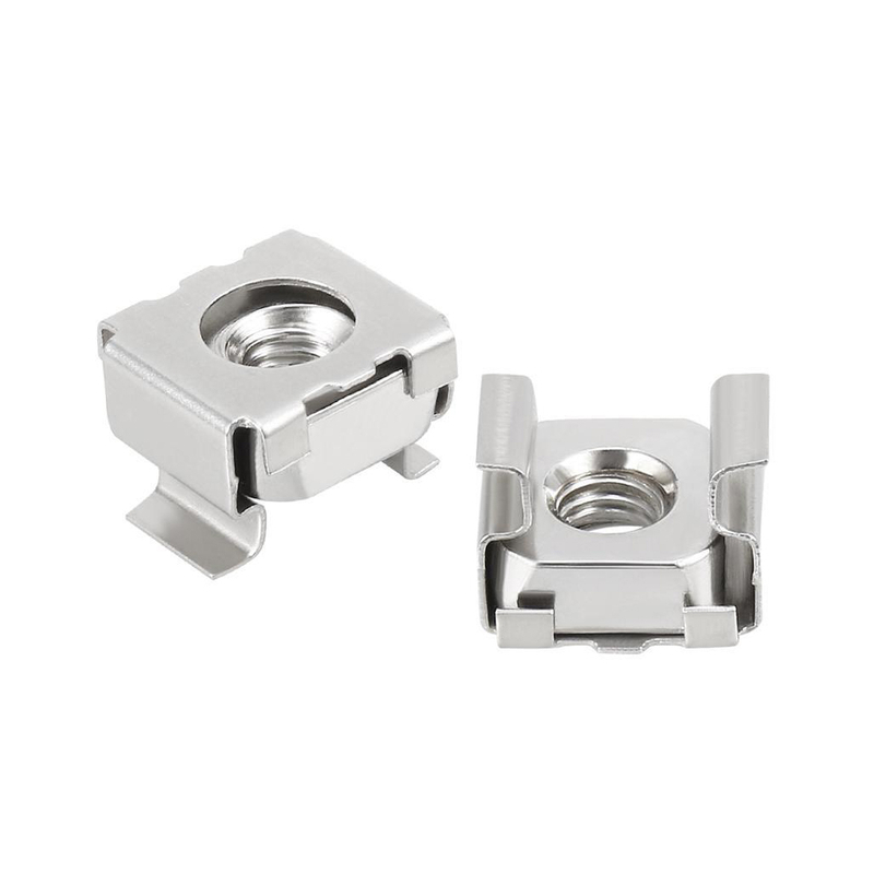 Uma porca quadrada flutuante presa dentro de uma gaiola de aço com mola.A gaiola possui duas pernas de retenção no mesmo lado da porca, posicionadas a 180° uma da outra, que prendem a porca no lugar nas bordas do painel ou nos locais centrais do painel.