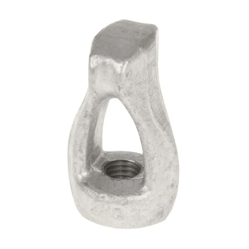 A porca de olhal dedal é montada com a extremidade roscada do parafuso de olhal de 1/2 ou 5/8 de polegada, que atravessa o poste de madeira para apoiar os isoladores de tensão até o fio sem saída, a porca de olhal duplo é usada com cabos duplos.O principal processo de fabricação de nozes é o forjamento.O material é barra de aço.